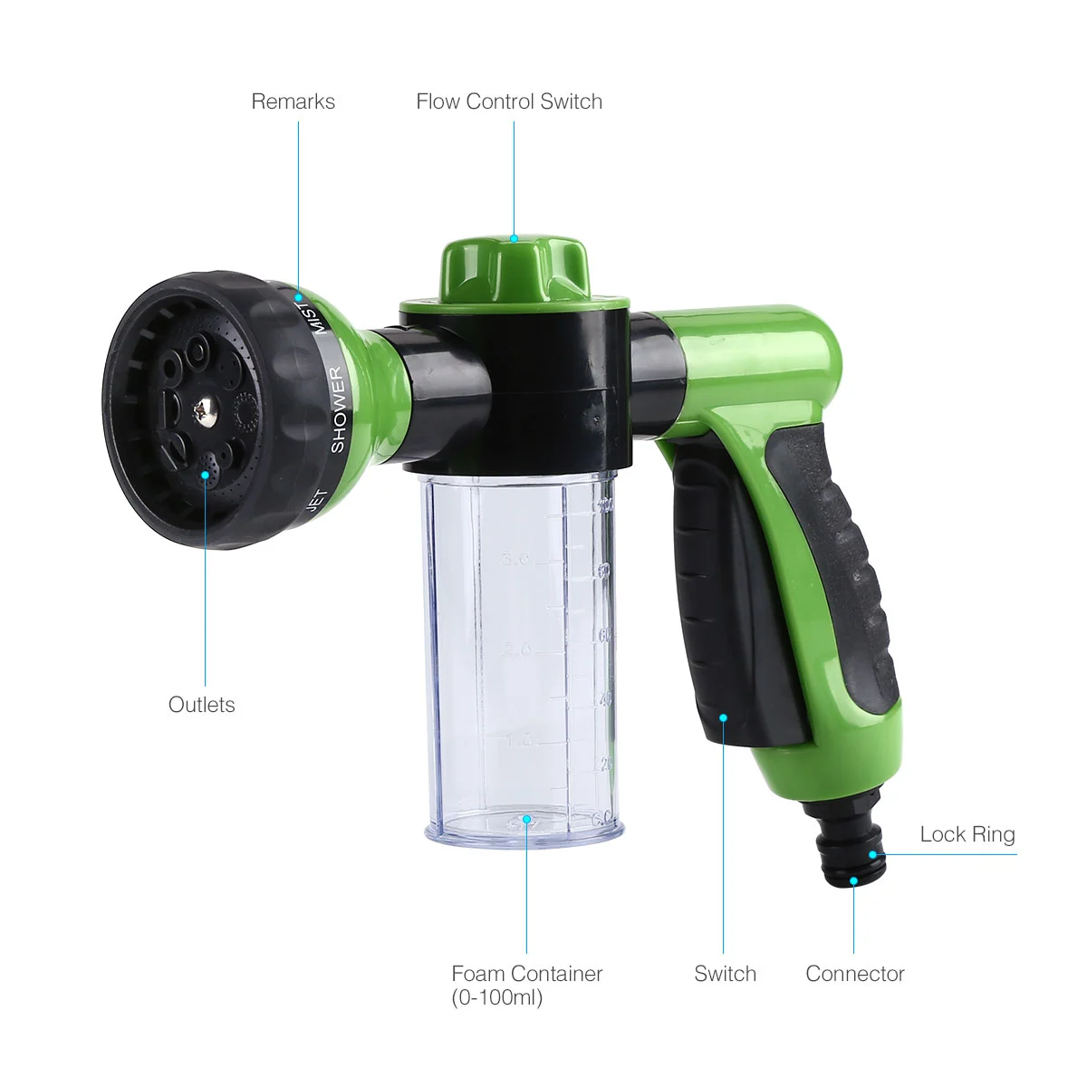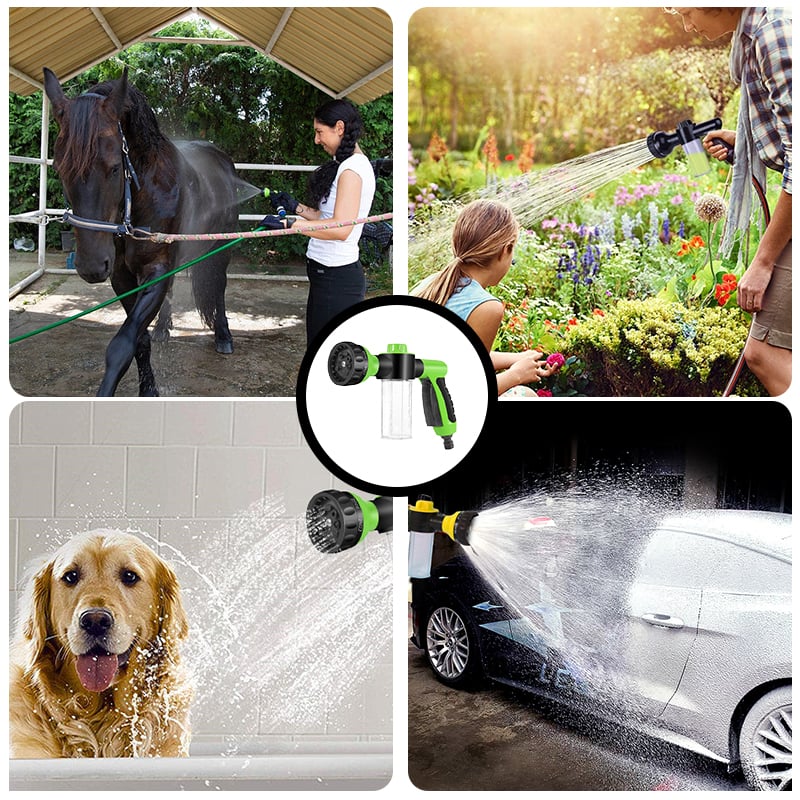 8 In 1 Spray Patterns: The foam gun has 8 types of spouts ,spin- click spray selector different settings ( rinse, stream, flat, center, jet, shower, mist and cone) which can spout water in 8 patterns for different uses, spray nozzle for garden hose fulfill your different needs. Best for Watering Plants, Lawn, Patio, and Washing Car, Showering Pets.